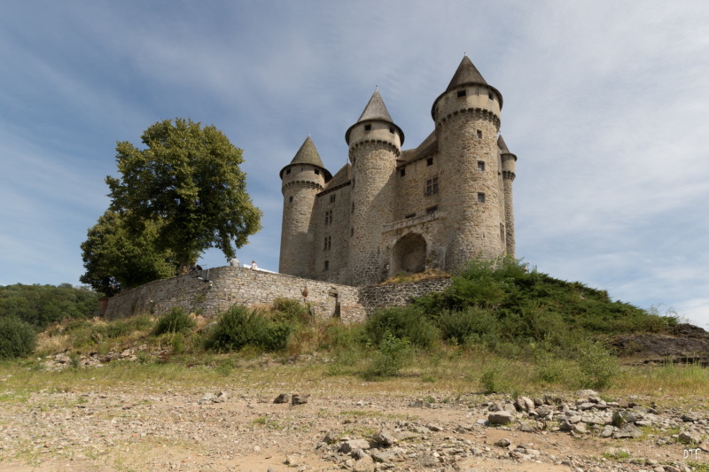 Forteresse du XVe siècle, le château de Val apparaît majestueux, sur son îlot rocheux, baignant sa fine silhouette aux six tours couronnées de mâchicoulis dans l'immense lac de Bort.
